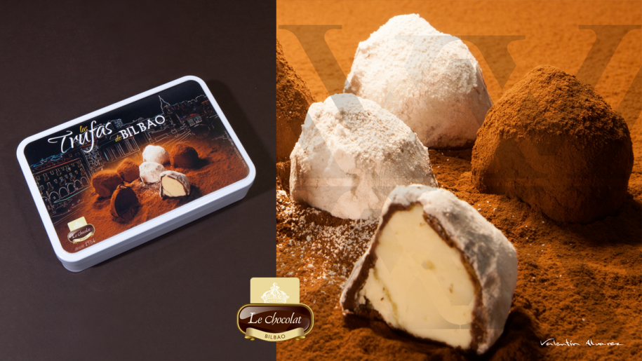 Hemos realizado un grafismo con la connotación de un rincón del casco viejo de Bilbao, y unas fotografías del producto, realizando con el polvo del cacao una base para asentar las trufas y formando visualmente una atracción entre el Polvo del Cacao y las Trufas, dando como resultado un Packaging que atrae nuestros sentidos y pone en marcha el mecanismo de nuestras papilas gustativas.