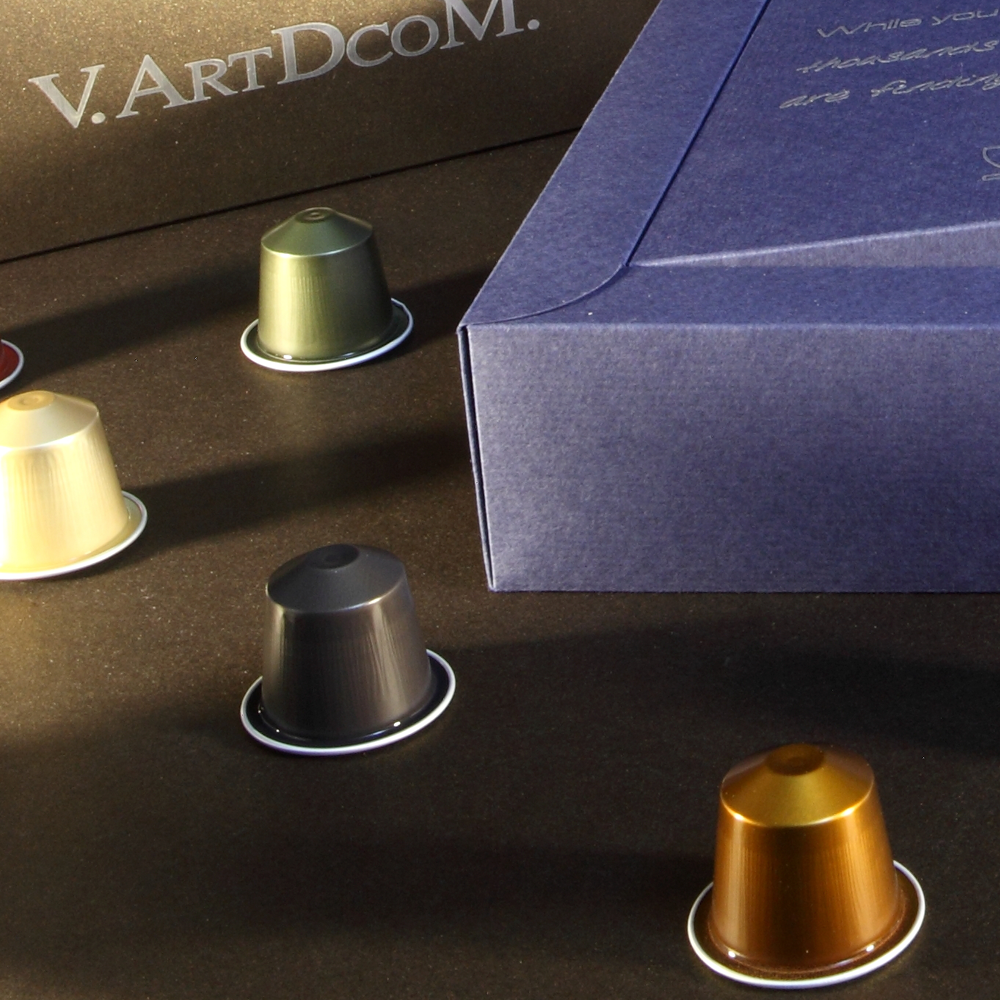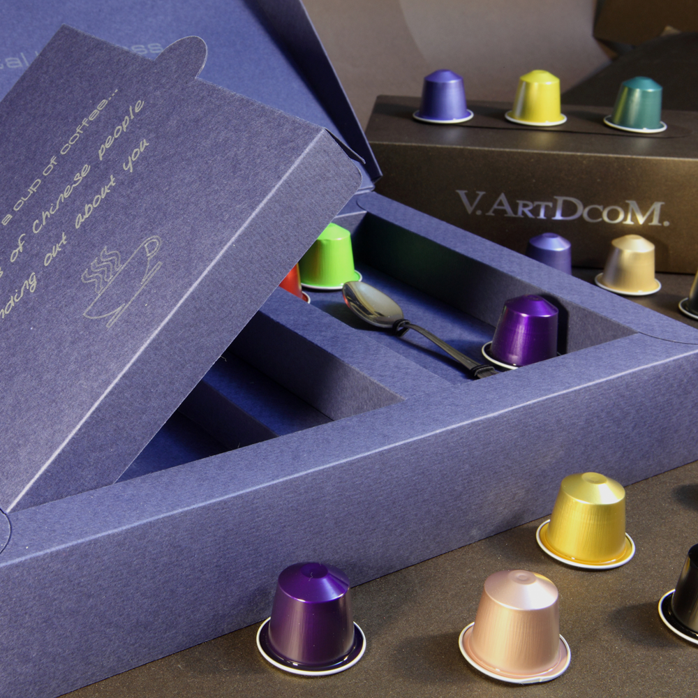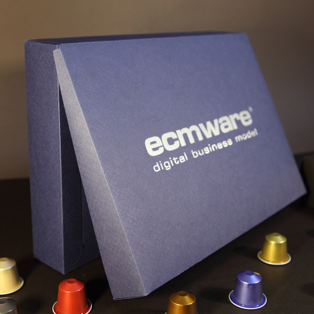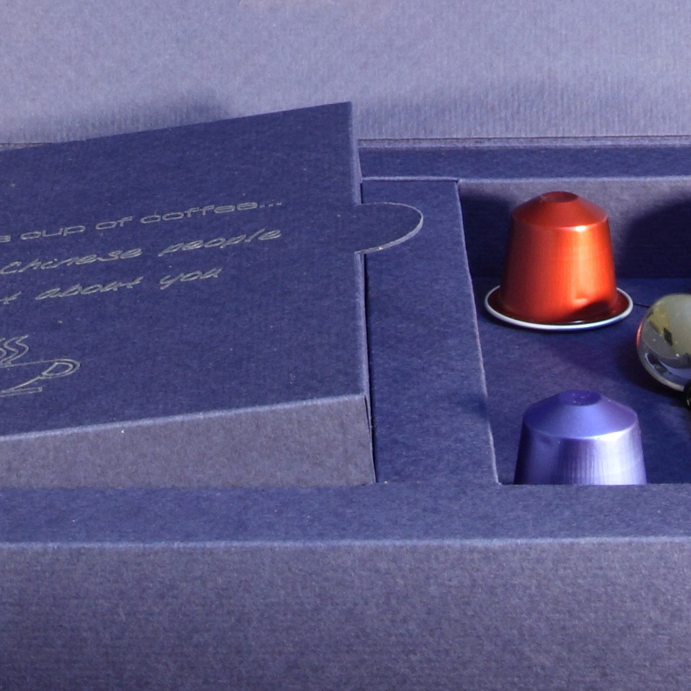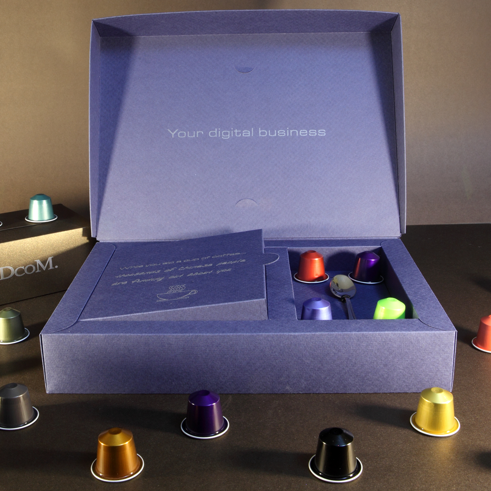Marketing directo como destino China. Una caja compleja con cierre suave, un papel creativo con textura, personalizada con mensajes impresos en plata, para contener varios elementos (Flyer…) y un calentador USB de tazas de Té o Café.